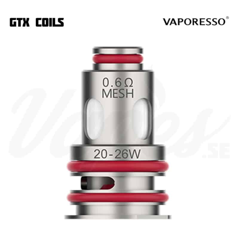 | Vaporesso GTX 18 Tank | 0.6 / 0.8 / 1.2 ohm (Mesh & Regular, även TS) | 0.6–1.2 ohm |