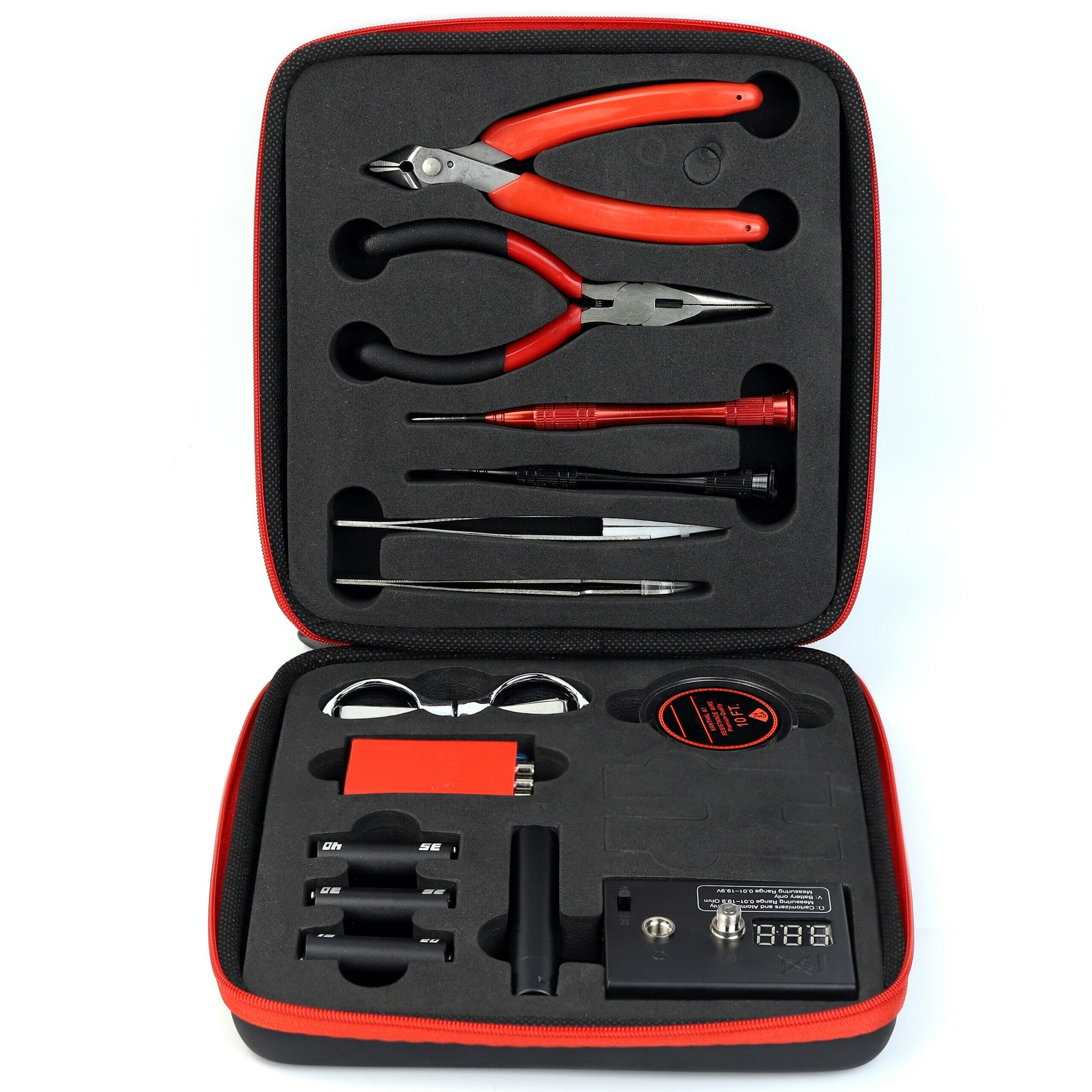 Detta veryktygsset innehåller följande; diagonaltång, nåltång, hopfällbar sax i rostfritt stål, keramik- och precisionsspincett, en jiggsats för coils och en HEX-skruvmejsel i T-stil för att klara alla ombyggnadsuppgifter. Satsen innehåller också Philips- och plattskruvmejslar i pennformat, en 10ft 24GA Kanthal A1-tråd, en ohm-mätare för optimal prestandakontroll.