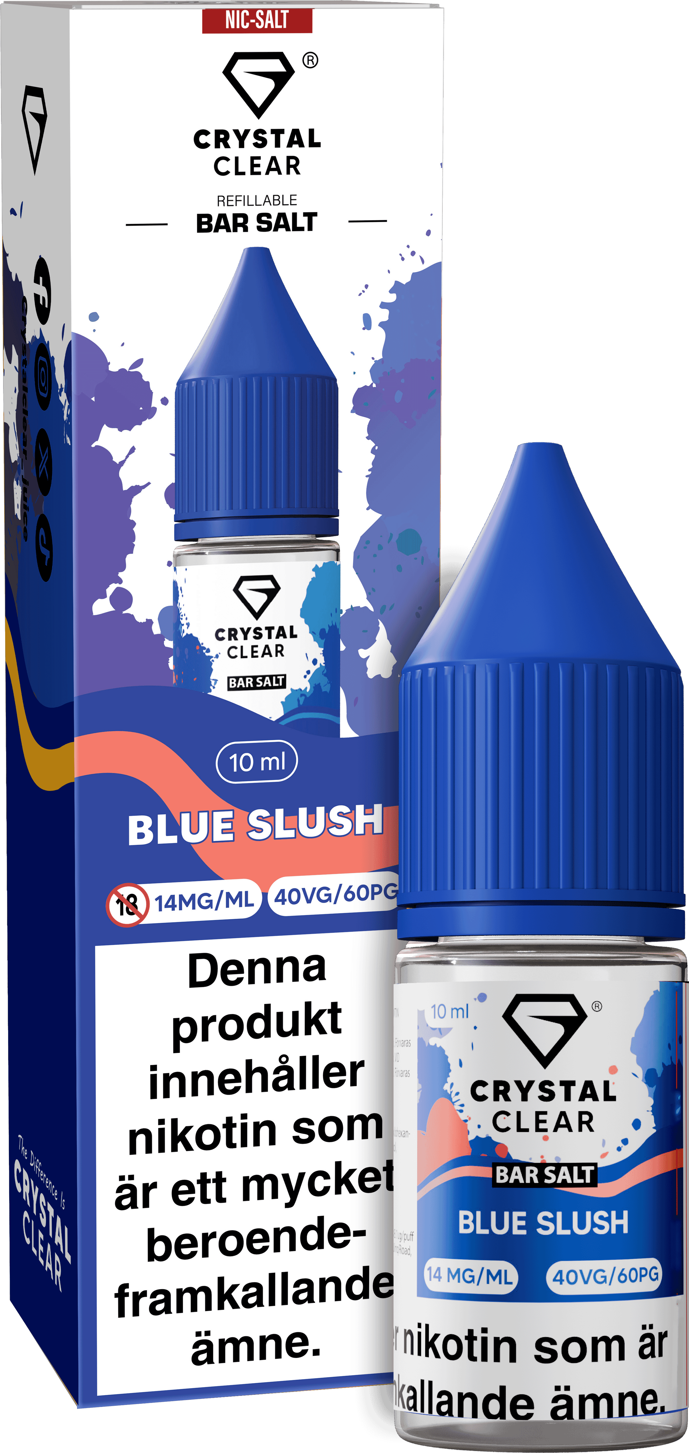Crystal Clear – Blue Slush är en nikotinsaltbaserad e-vätska med smak av blåhallon-slush tillsammans med kyla. Produkten levereras i 10 ml flaska och innehåller 14 mg nikotin per milliliter (nikotinsalt).