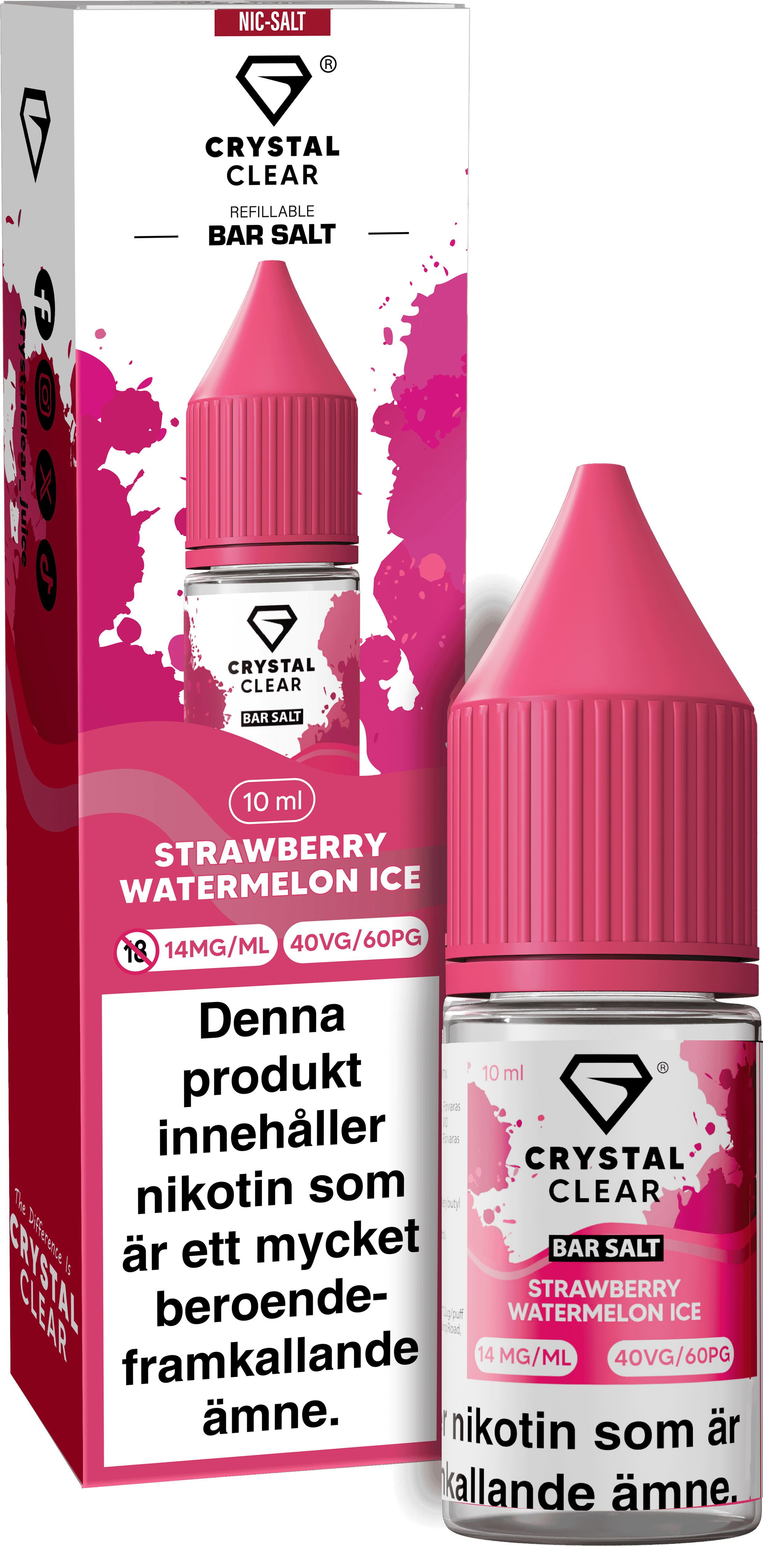 Crystal Clear – Strawberry Watermelon Ice är en nikotinsaltbaserad e-vätska med smak av jordgubbe och vattenmelon med kyla. Produkten levereras i 10 ml flaska och innehåller 14 mg nikotin per milliliter (nikotinsalt).