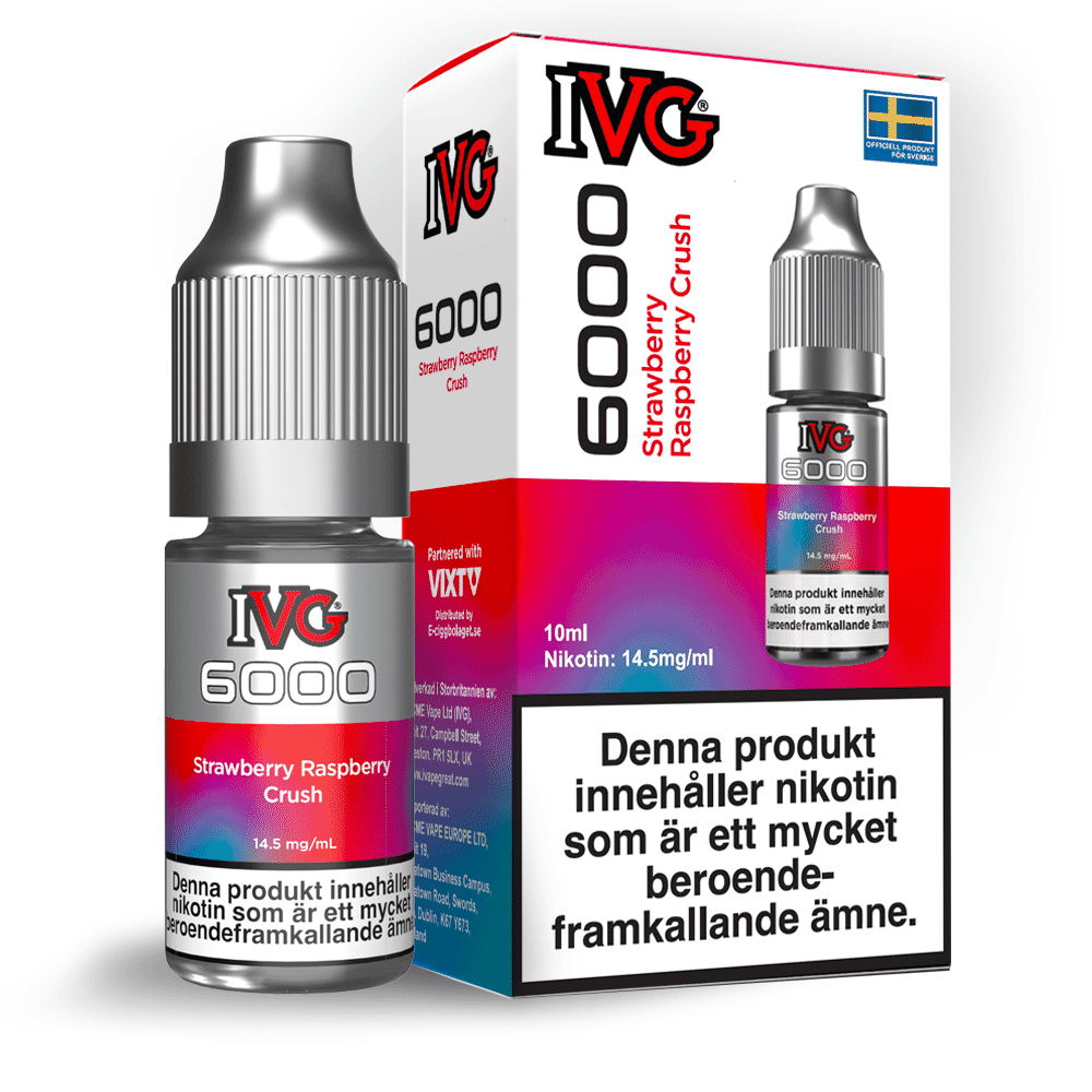 IVG 6000 Salts Strawberry Raspberry Crush är en nikotinsalt e-juice med 14,5 mg/ml i nikotinstyrka med smak av jordgubb och hallon.