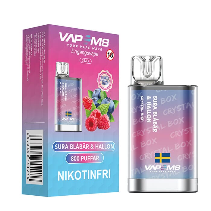 VapeM8 Crystal Box – Sura Blåbär & Hallon är en nikotinfri engångsvape med smak utav blåbär och hallon med lätt kyla.