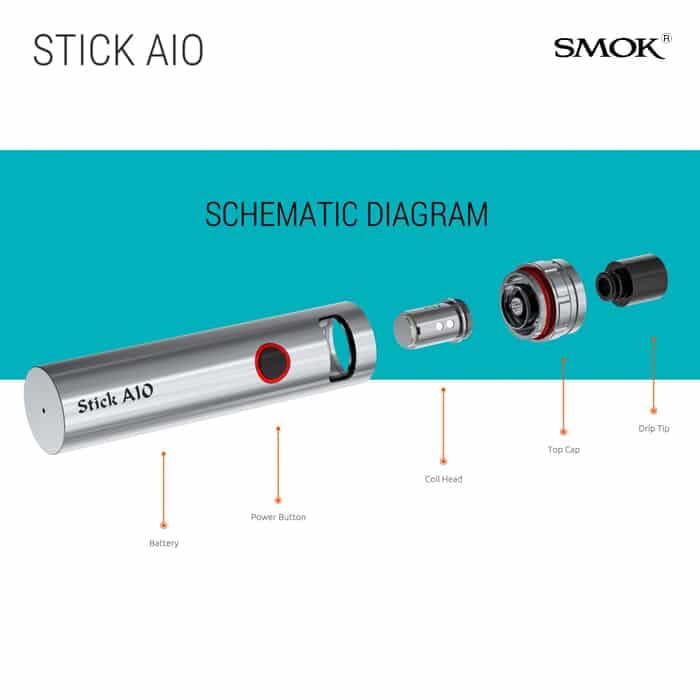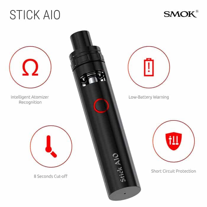 SMOK Stick AIO är en allt-i-ett e-cigarett med läckagefri tank, smidig påfyllning via toppen, inbyggt 1600 mAh batteri och endast en knapp krävs för att använda den. Inga inställningar behöver justeras, då detta sköts automatiskt. E-cigaretten har många säkerhetsfunktioner för en säker användning.