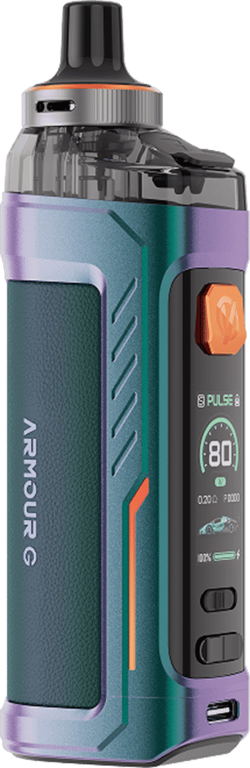 Armour G Kit är det senaste tillskottet i pod-mod kategorin från Vaporesso, kitet är utrustat med ett inbyggt 3000mAh-batteri med ny teknik från patenterade Mega Batt som tillåter en mer kompakt och komprimerad storlek och enheten levererar upp till 80W i effekt. Detta e-cigarett kit använder en 0,96″ TFT-färgskärm och är försedd med den senaste Neo PULSE MODE- och COREX-tekniken, vilket ger starkare effekt och förbättrad smakupplevelse.