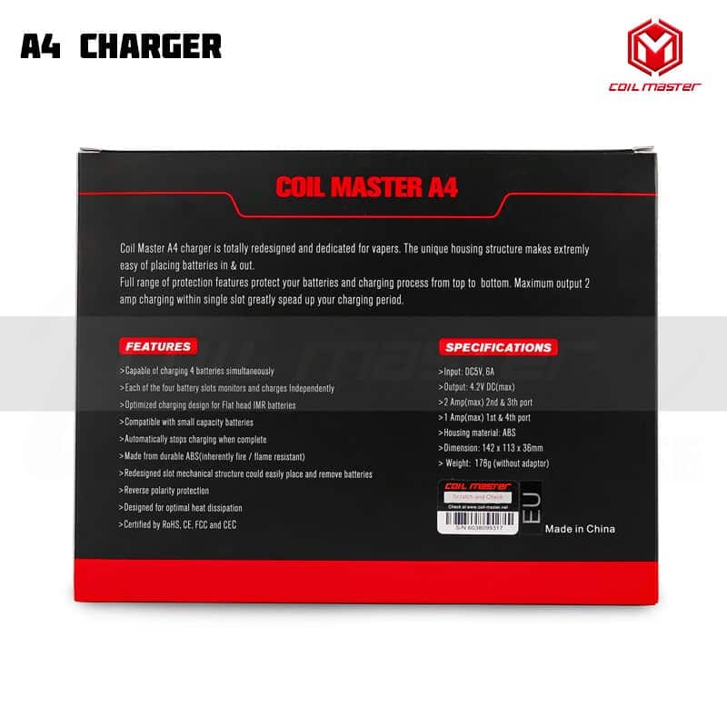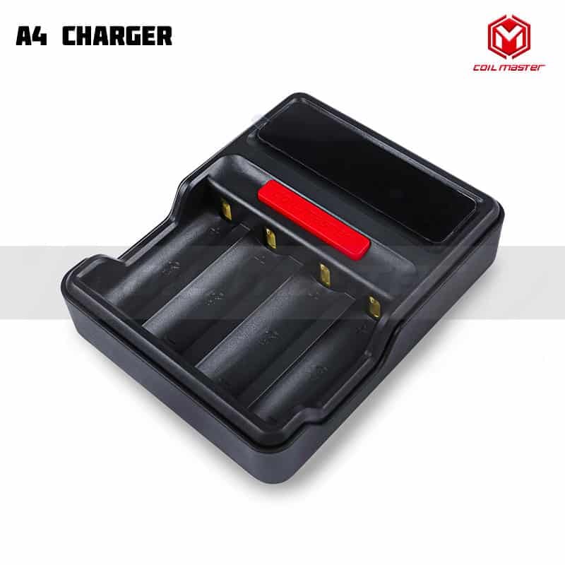 Coil Master A4 är en laddare designad för 18650- & 26650-batterier, de två typer som mest används till e-cigaretter. Med snabbladdning upp till 2A laddar du batteriet väldigt snabbt. Slot 1 & 4 ger dig 1A Max. Slot 2 & 3 ger dig 2A Max. Till skillnad från andra laddare så är slottarna snällare mot dina batterier, genom att inte ha starka fjädrar som sliter på höljet/wrappen. Det går att ladda upp till 4 batterier samtidigt. Placera dem i facken/slottarna och rotera lätt så att de får anslutning.