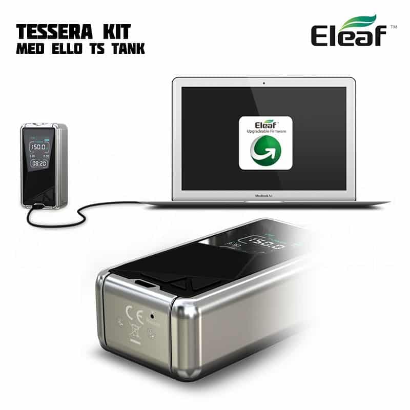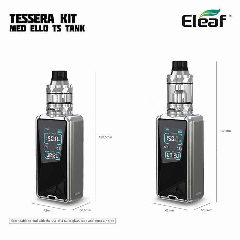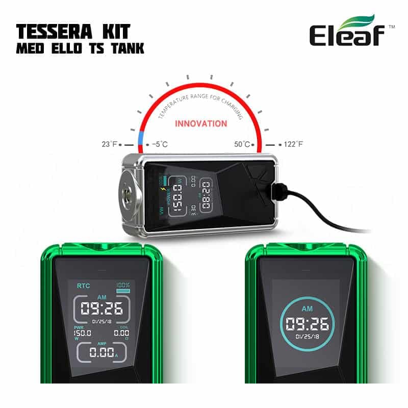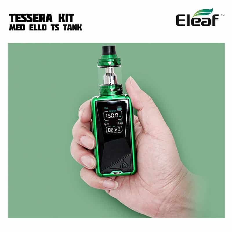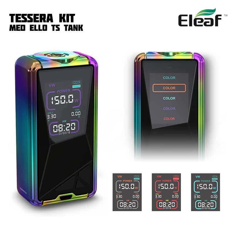 Eleaf Tessera Kit är en kompakt enhet storleksmässigt, men samtidigt byggd för att vara kraftfull då den går upp till 150 W. Avfyrningsknappen är integrerad i ena sidopanelen, vilket gör att du kan greppa den vid användning. Påfyllning av tanken sker via topplocket, genom så kallad top fill. De nya medföljande förbrännarna/coilsen från Eleaf – EC2, är byggda för hög ångproduktion. Enheten har ett inbyggt 3400 mAh-batteri, som kan laddas upp till 2 A (så kallad snabbladdning) via medföljande laddningskabel. Inkluderar en inbyggd klockfunktion med datum och tid, samt 5 olika färgteman på gränssnittet för att kunna göra den mer personlig.