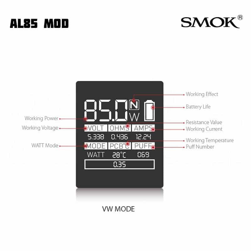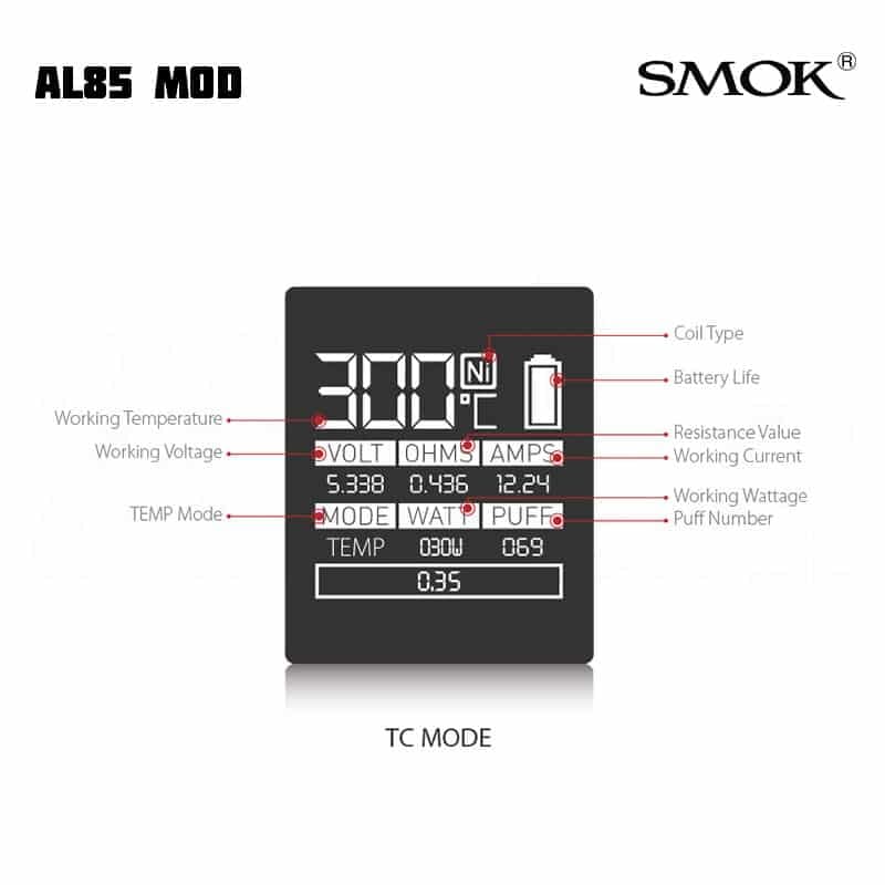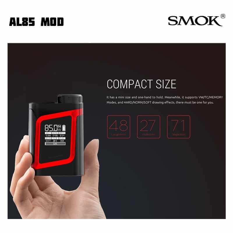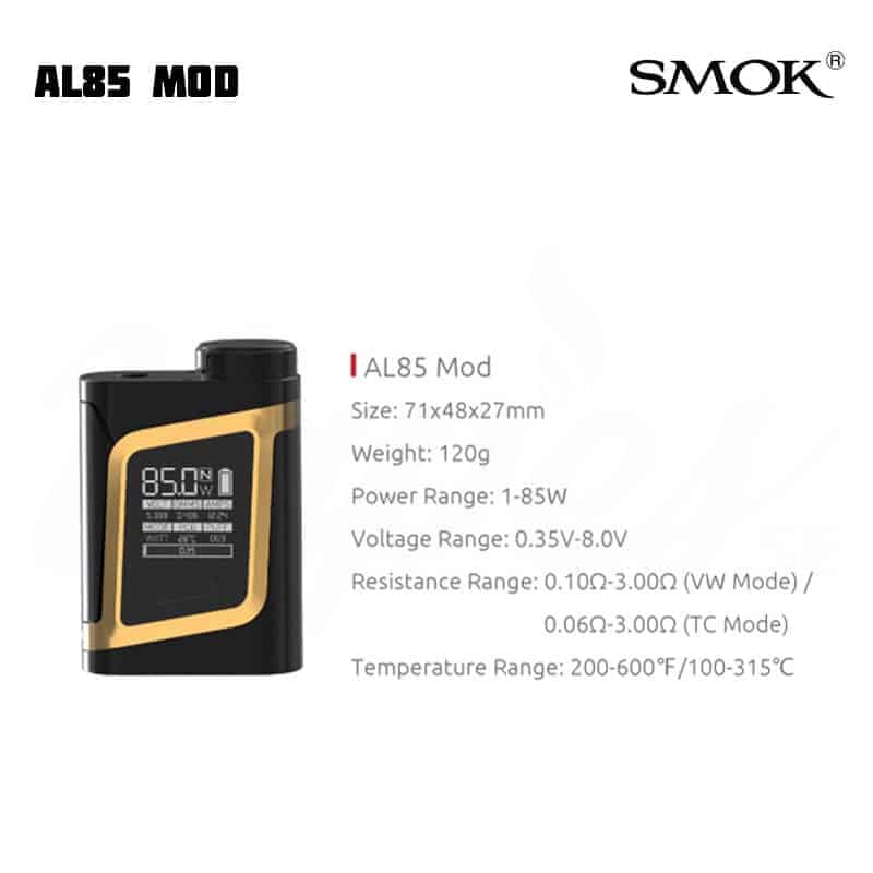 SMOK AL85 ger dig upp till 85W, har stöd för temperaturkontroll, har plats för ett 18650-batteri (köpes separat här) och har en ergonomisk avfyrningsknapp som aktiveras av att du greppar sidan på enheten.