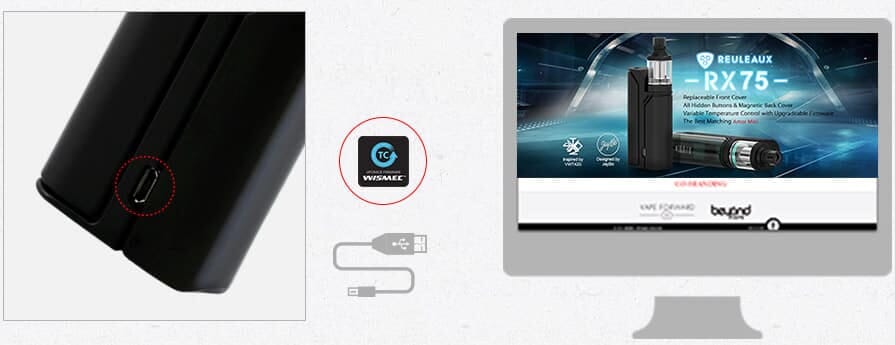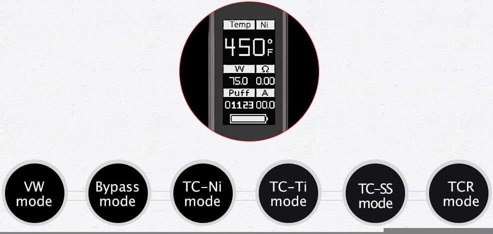 RX75 ger en maxwatt på 75W och i temperaturkontroll klarar den av trådtyperna Nickel (TC-Ni), Titanium (TC-Ti), och Stainless Steel (TC-SS). Förutom temperaturkontroll finns det även det vanliga VW-läget (Variabel Watt) där du kan använda kanthalbaserade coils istället. Bypass mode låter dig använda enheten som om den vore mekanisk. I det mer avancerade TCR-läget kan du finjustera inställningarna ner på trådnivå för maximal upplevelse.