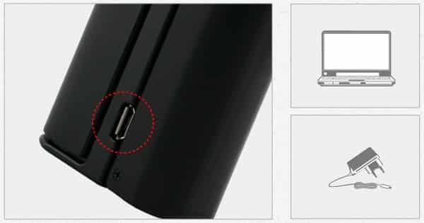 Laddning blir alltid bättre i en extern batteriladdare, men RX75 kommer även med en integrerad Mikro USB-port där du kan ladda batteriet direkt via medföljande USB-kabel. Laddningstid beror på vilket batteri du väljer.